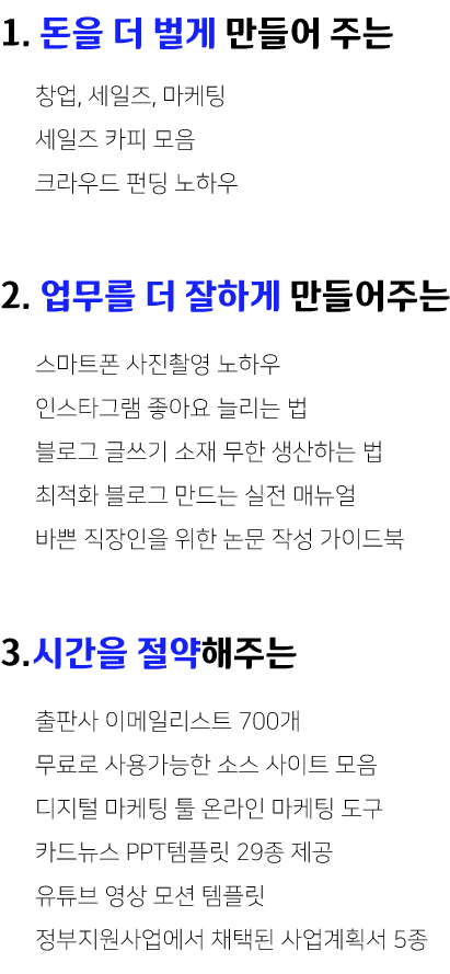 나의 수고(각종 검색 등) 를 덜어주는 해결법이 담긴 전자책이라면 반드시 팔린다.