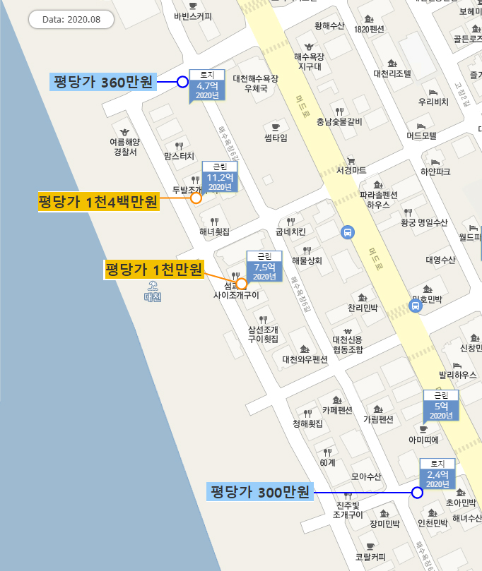 해안가에 붙은 근린상가 토지 시세는 평당 1천만원을 넘나들고