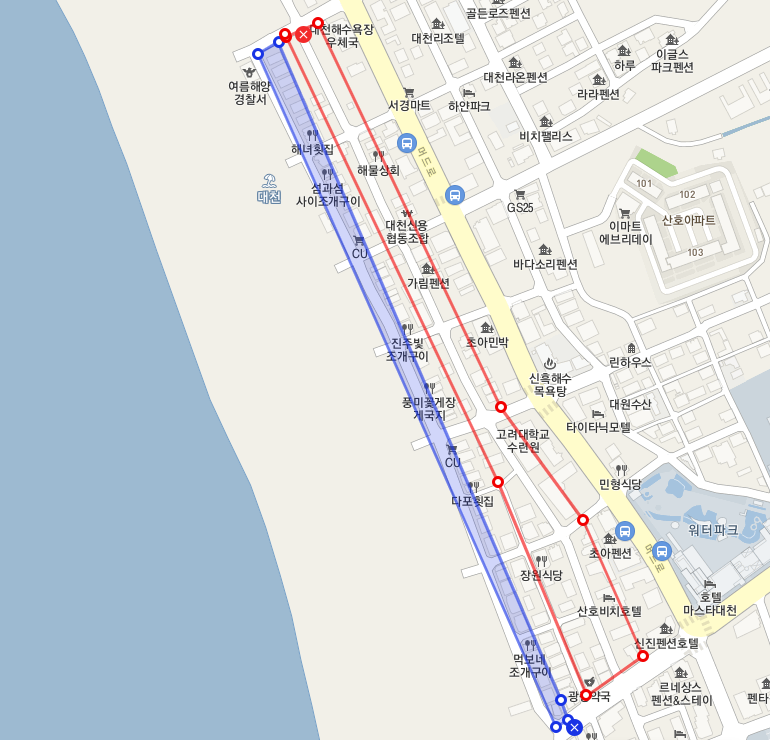 바닷가길과 한 블록 안으로 들어왔을 때 유동인구 수 차이가 너무 심하다.