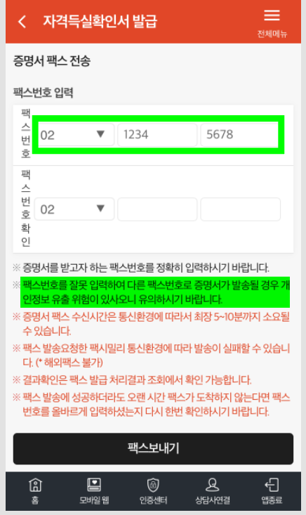 팩스 번호를 필요한 곳이 아닌 엉뚱한 번호로 입력하면 나의 개인정보(주민번호, 건강보험 가입 이력 등)가 모두 유출되는 것이기에 팩스 번호가 맞는지 2~3회는 더 확인한 뒤 '팩스보내기'를 누르자.