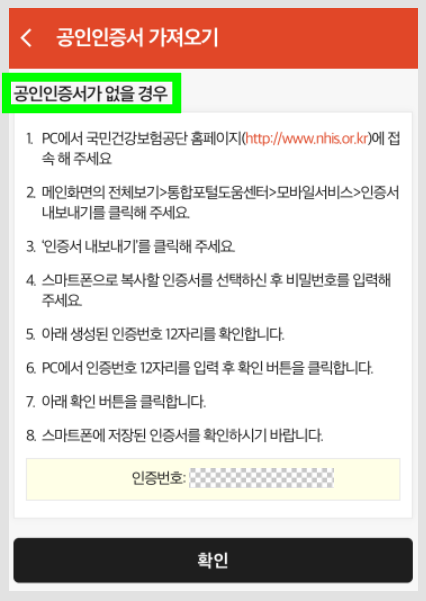 건강보험공단 홈페이지 접속 > 메인화면의 전체보기 > 통합포톨도움센터 > 모바일서비스 > 인증서내보내기 클릭