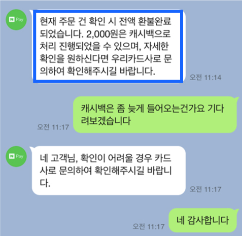 네이버페이에서 결제하고 환불한 건에 대해서는 네이버페이에 문의해보라는 답 뿐이었다.