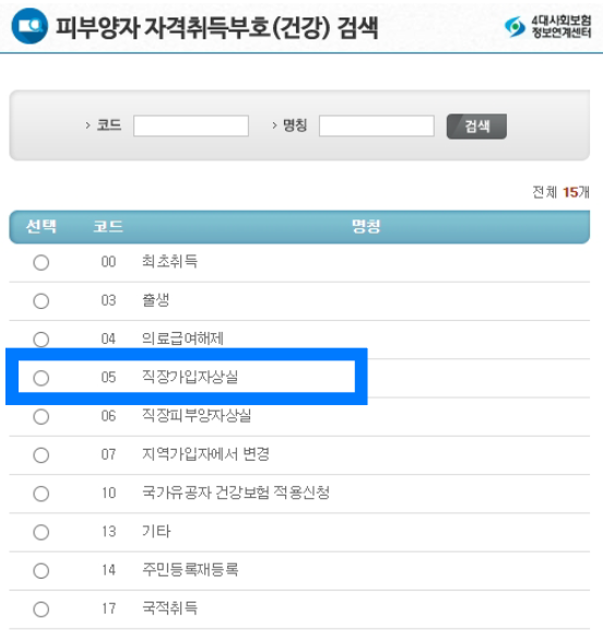 취득부호 : (아래 캡쳐 파일 첨부) 예) 퇴직했으면 직장가입자 상실, 남편(부양자)가 직장가입자 상실을 하면서 아내도 같이 상실 되었다면 직장 피부양자 상실 선택