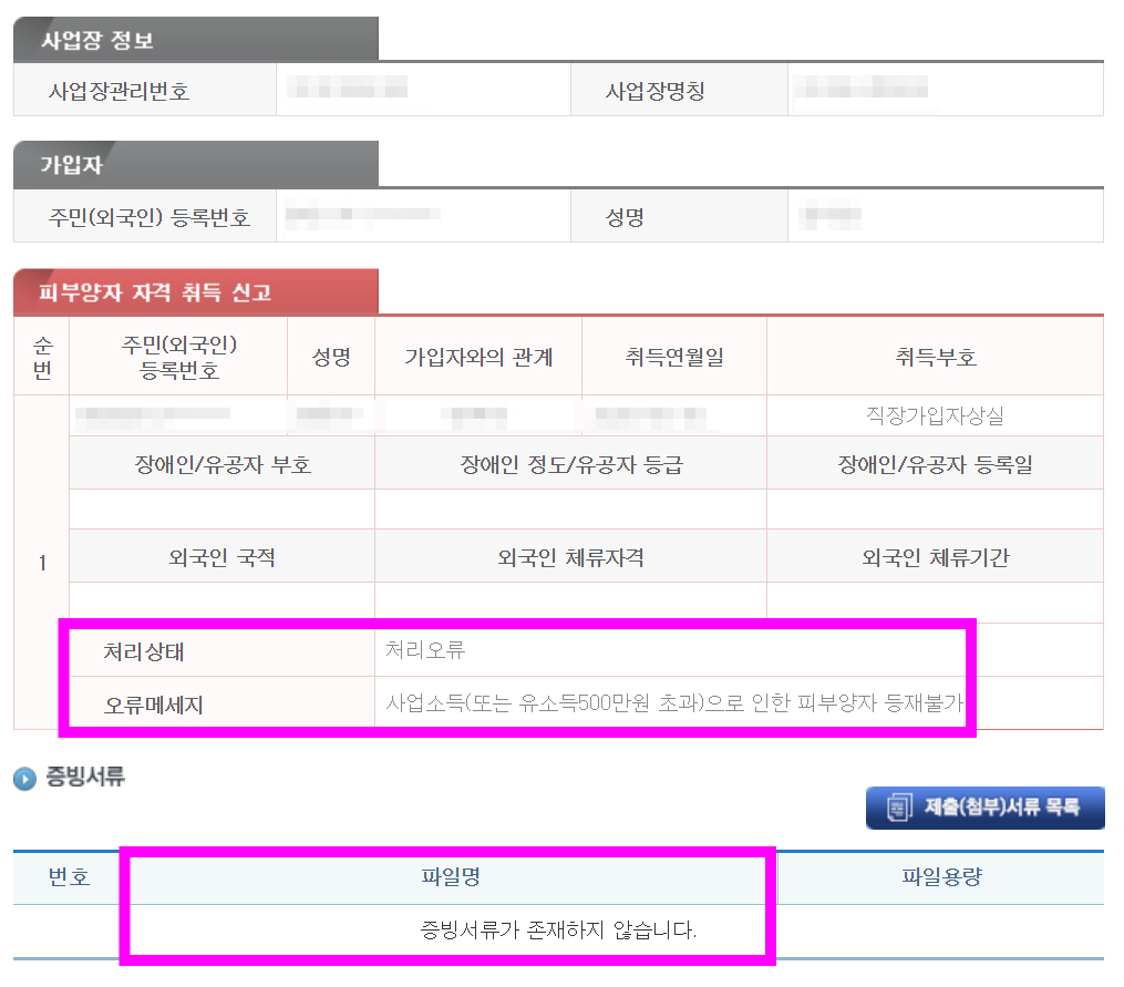 그 전에 한 번 반려당했을 때는 아래와 같은 화면이 떴다. 처리오류 라고 뜨며 사업소득(또는 유소득500만원 초과)로 인한 피부양자 등재불가 라는 메세지가 같이 떴다.