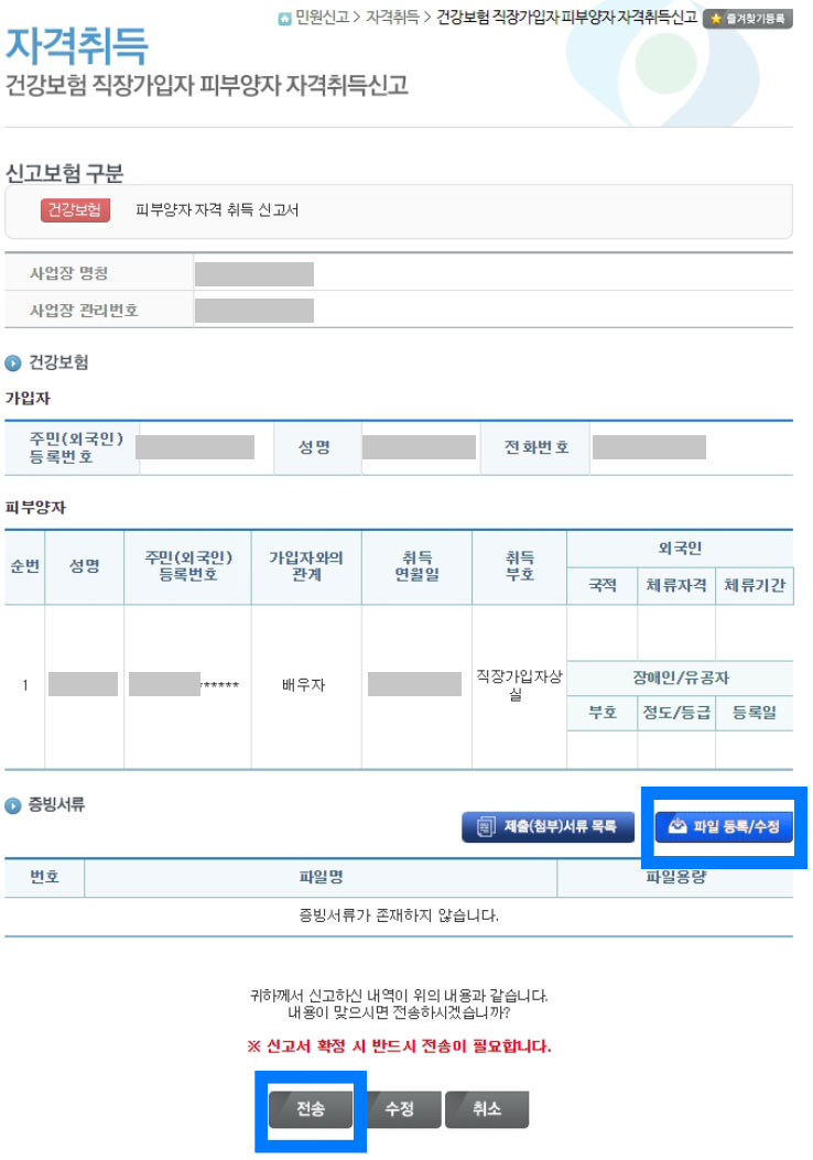 피부양자 자격 취득 신고란 정보 기입 후