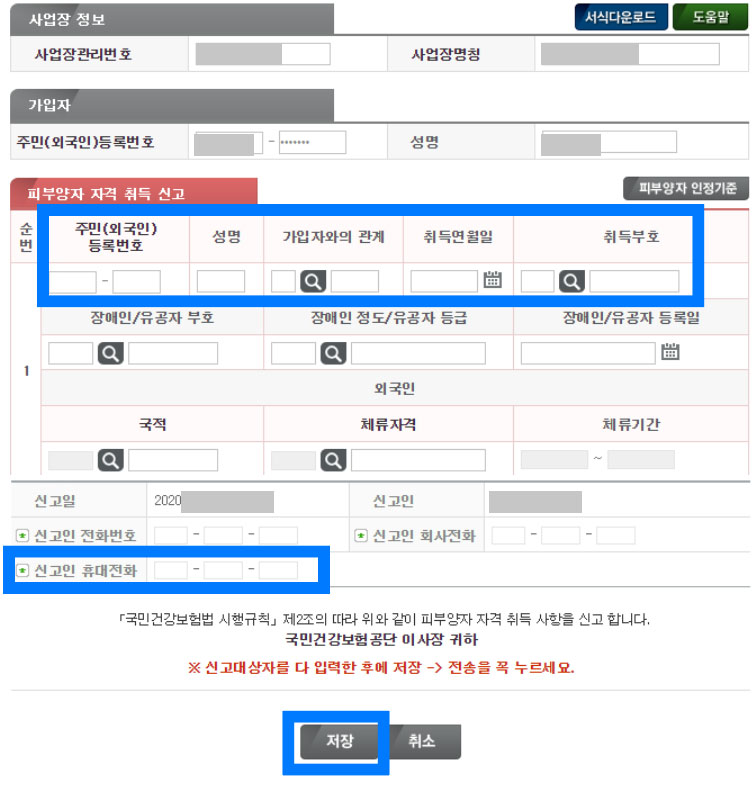 피부양자 자격 취득 신고란 정보 기입