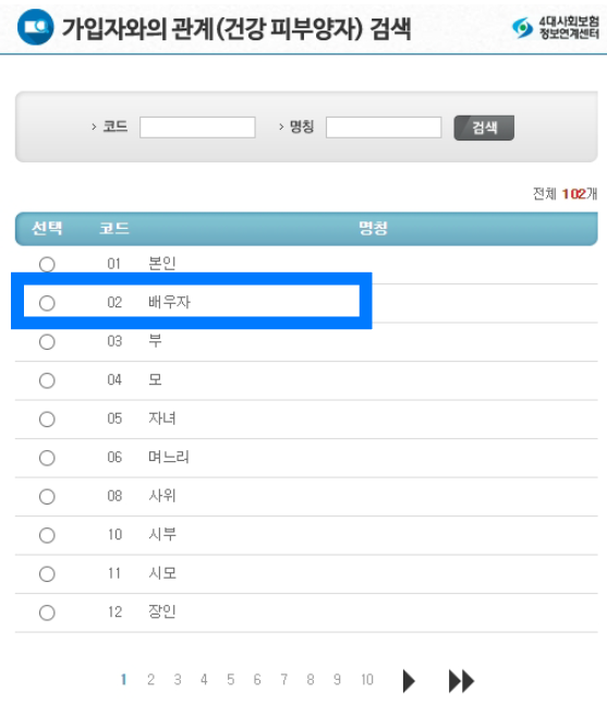 가입자와의 관계 : 남편이나 아내라면 배우자, 부모님이라면 부 혹은 모 등등