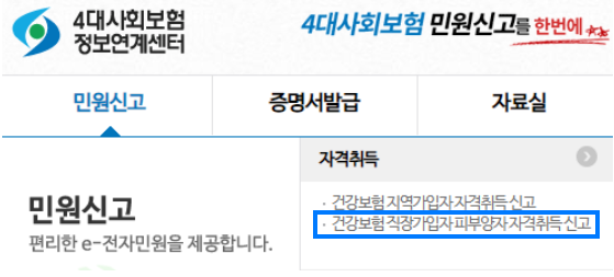 민원신고 > 건강보험 직장가입자 피부양자 자격취득신고 클릭