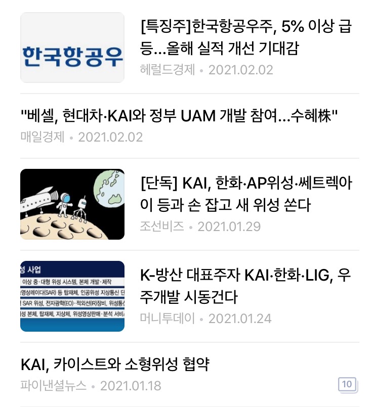 2018년 매수 후에 단 한 번도 좋은 뉴스를 본적이 없던 것 같은데.. 올해 들어 항공우주 주식에 좋은 소식이 많이 들린다. 미국에서도 항공우주에 관심을 갖기 시작하고 투자 소식이 많이 들려오니 한국항공우주뿐만 아니라 다른 항공우주 관련주들도 많이 뛰어오를 준비를 하고 있는듯하다.