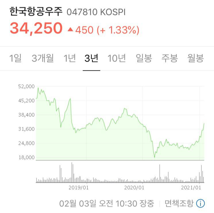 2020년 내내 2만원 초반대에 머무르던 한국항공우주 주가 2021년 1월이 되어 아주 오랜만에 3만원을 넘어섰다.