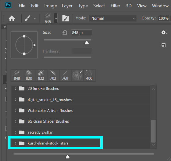 포토샵 브러쉬 창에 방금 추가한 브러쉬가 들어와있다.