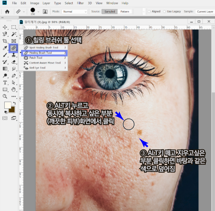 섞이도록 잡티를 제거할 수 있는 힐링브러쉬