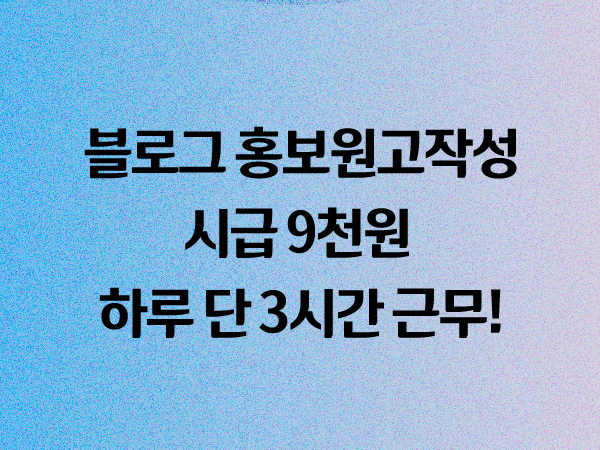 블로그 홍보 원고작성을 하는 업무로 재택근무가 가능하다. 원고작성뿐 아니라 사진 촬영도 업무에 포함되며 시급은 9천원이다. 이 업무 역시 빨리 할수록 내 시급의 가치가 높아지는 업무이다.