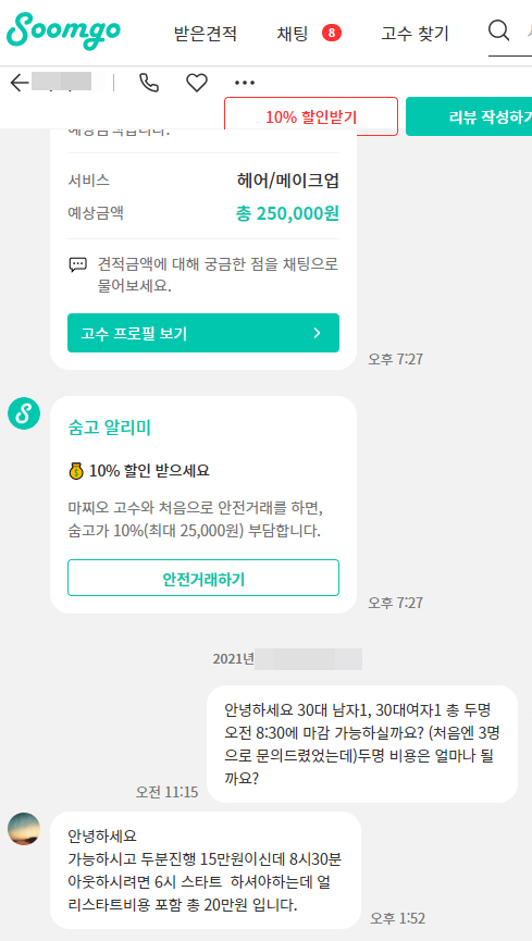예약하며 나도 2명이 갈지, 3명이 갈지 시간도 변동가능성이 있어서 실시간으로 여러 질문을 할 필요가 있었다. 헤어메이크업은 새벽 6시쯤 시작하면 얼리스타트비용이란걸 받는다. 나 결혼할 때는 패키지로 진행해서 가격을 몰랐는데 숨고로 서비스 예약하며 참 다양한 옵션이 있다는 걸 알게되었다.
