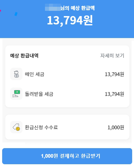 나도 조회해봤는데 1만3천원 돌려받을 수 있다고 나온다.ㅋㅋㅋ 1만3천원을 받기 위해서는 1천원의 수수료를 결제해야한다. 아직 결제는 안했다. 회사 다닐때야 재무팀에서 소득신고를 알아서 잘 해줬을테고 프리랜서 되고나서도 매년 세무사 통해서 종합소득세 신고 열심히 했더니 환급받을게 별로 받을게 없는 것 같다. 그리고 탈퇴도 당일날 바로 가능해서 환급금이 궁금하다면 가입해서 한번쯤은 조회해볼만하다.
