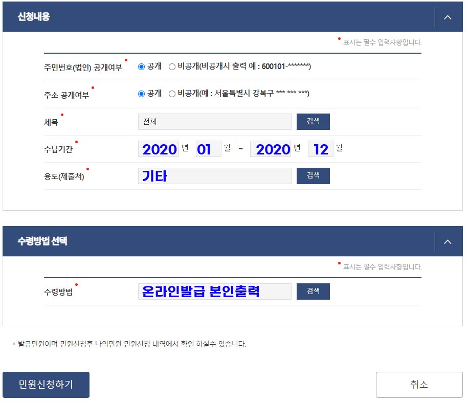 수령방법 : 인쇄하거나 PDF 저장할거라면 '온라인발급(본인출력)'