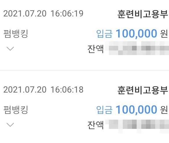 나의 예를 들어보자면 7월6일에 수업이 종료됐고 7월20일에 훈련비가 두 달치 한 번에 입금되었다. 수업종료날로부터 약 2주 뒤에 훈련비가 모두 지급된 것이다.