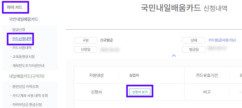 HRD-net 홈페이지 접속 - 최상단 [마이서비스] - 좌측사이드바 [마이카드] > [국민내일배움카드] - [카드신청내역] - 초록색박스로 된 [신청서보기] 클릭