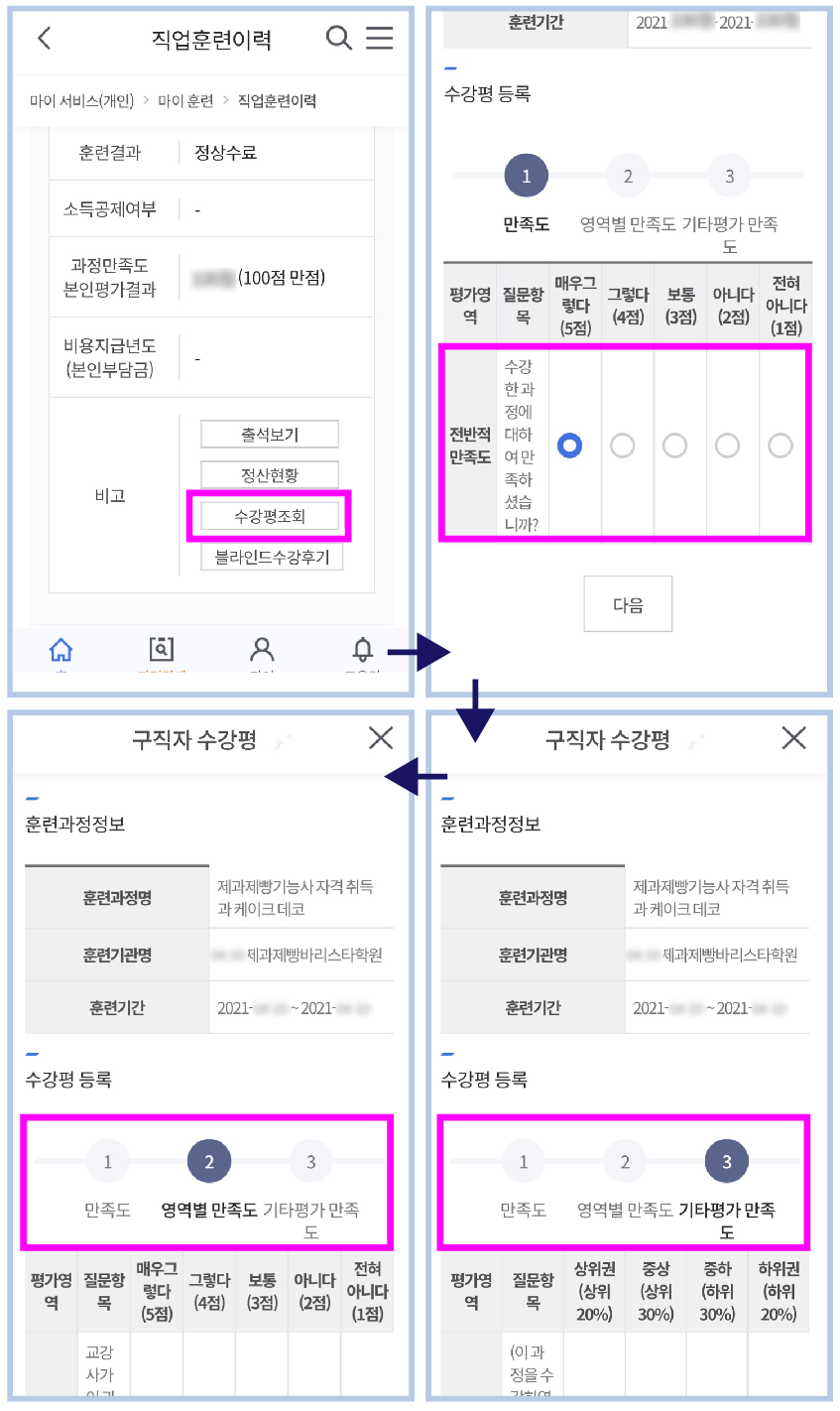 화면 하단 [수강평조회] - [만족도] 점수로 평가 (아래로 항목들 쭉 이어짐) - [영역별 만족도] 평가 - [기타평가 만족도]