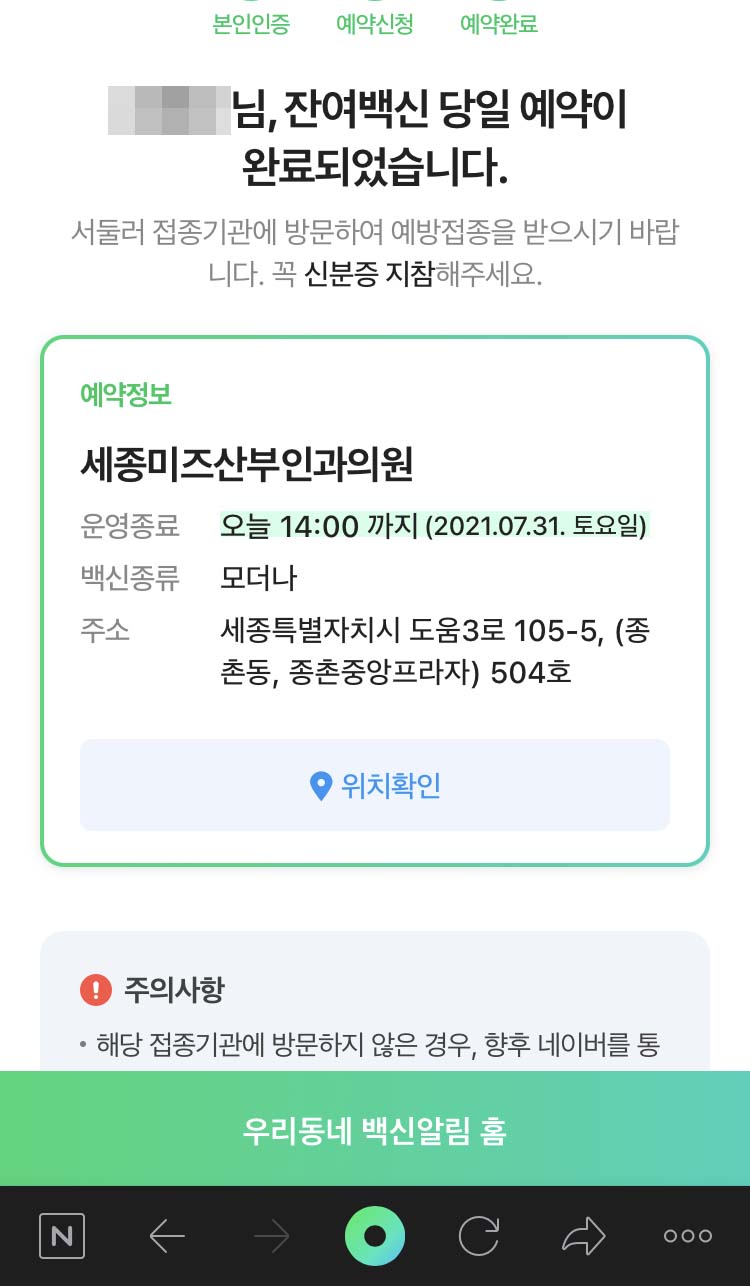 네이버 잔여백신 알람 등록을 해놓은지 일주일만에 예약에 성공했다.