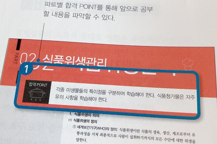 시험 본지 한달은 지났지만 미생물 증식의 3대요건은 아직도 잊혀지지 않는다. 영양소, 수분, 온도 ㅋㅋ 하도 여기저기서 강조를 해서 잊을 수가 없다. 시험에 자주 나오는 내용을 '합격보장 꿀팁'에 따로 표기해놓아 합격을 위한 효율적인 공부가 가능하다.
