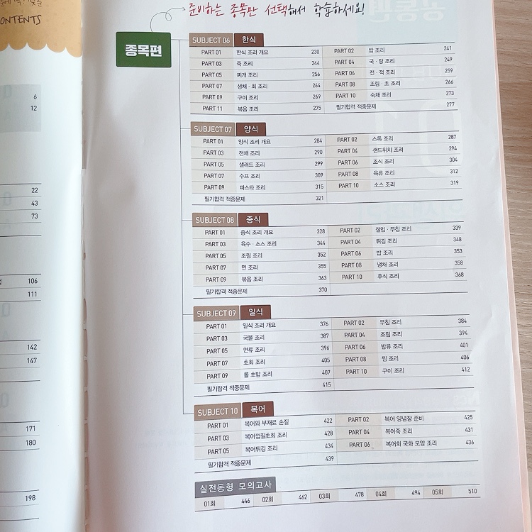 조리기능사 필기는 문제를 많이 풀어볼수록 좋은데 에듀윌 필기끝장 책에도 각 과목마다 풀어볼 수 있는 모의고사가 수록되어 있다.