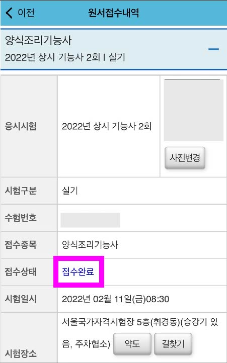 입금완료하면 큐넷에서 바로 '접수완료'상태로 바뀐다.