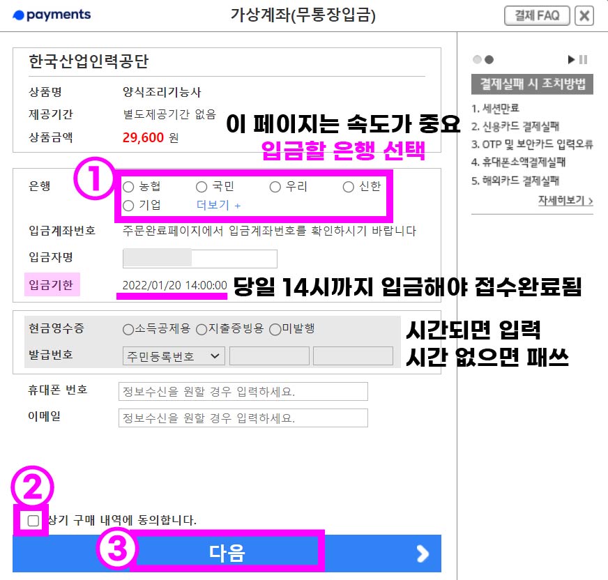 입금은행 선택 ▶ 동의여부 체크 ▶ [다음]버튼