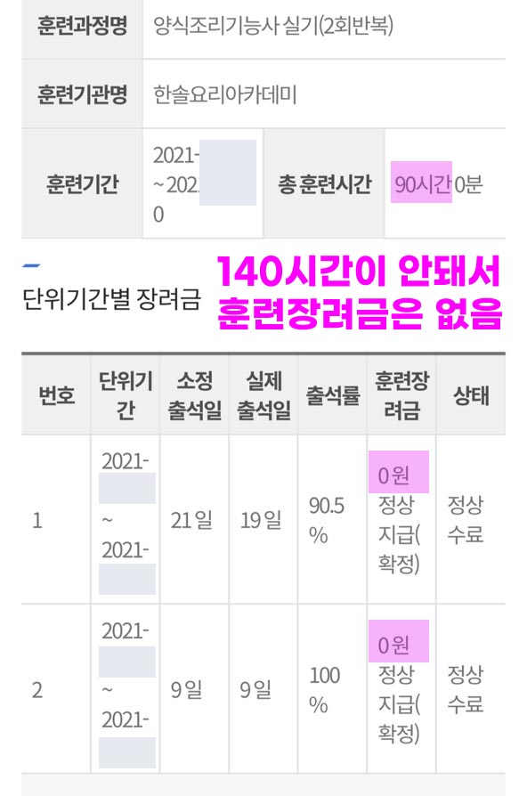 (출석률과 관계없이 140시간 미만 수업은 훈련장려금 미지급)