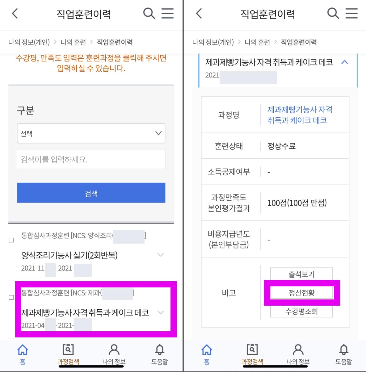 HRD net 앱 접속 및 로그인 ▶ 나의 정보 ▶ 나의 훈련 ▶ (밑으로 내려서) 정산현황