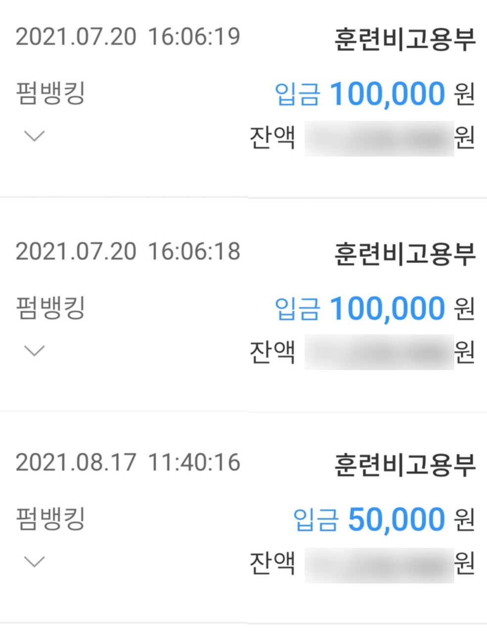 총 3회에 걸쳐 훈련장려금 입금됨
