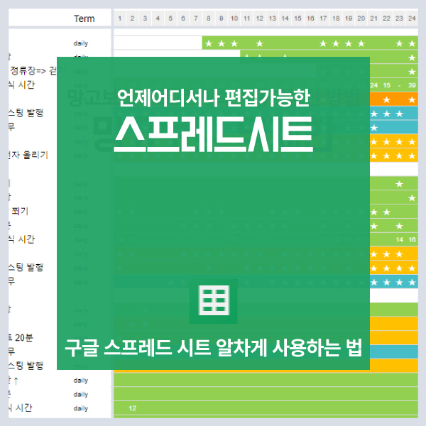 사용법이 엑셀과 거의 똑같은데 엑셀은 다운로드 받아야하는 번거로움이 있지만 스프레드시트는 인터넷만 된다면 데스크탑 혹은 노트북, 태블릿, 폰 어디에서건 수정 가능하다는 장점이 있다. 컴퓨터 앞에 앉아있을 때만 수정 가능하다면 순간의 아이디어나 기록을 놓칠 수 있는데 인터넷만 된다면 언제 어디서나 폰으로도 접속 가능한 점이 엄청난 장점이다.