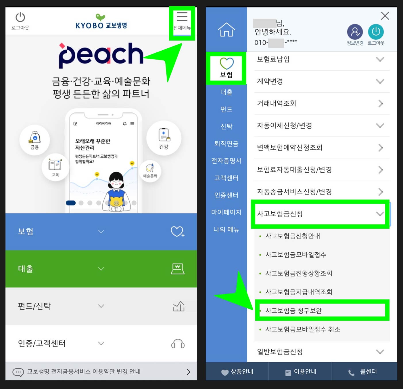 교보생명 앱 ▶ 상단 햄버거 아이콘 클릭 ▶ 보험 ▶ 사고보험금신청 ▶ 사고보험금 청구보완