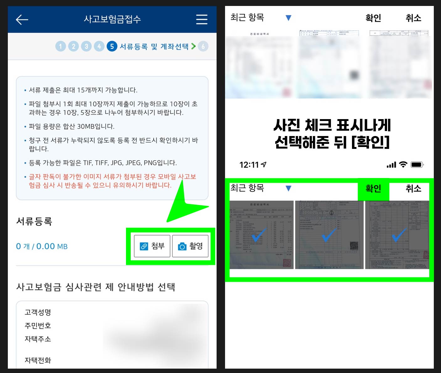 서류 첨부 ▶ 사진에 체크 후 [확인]