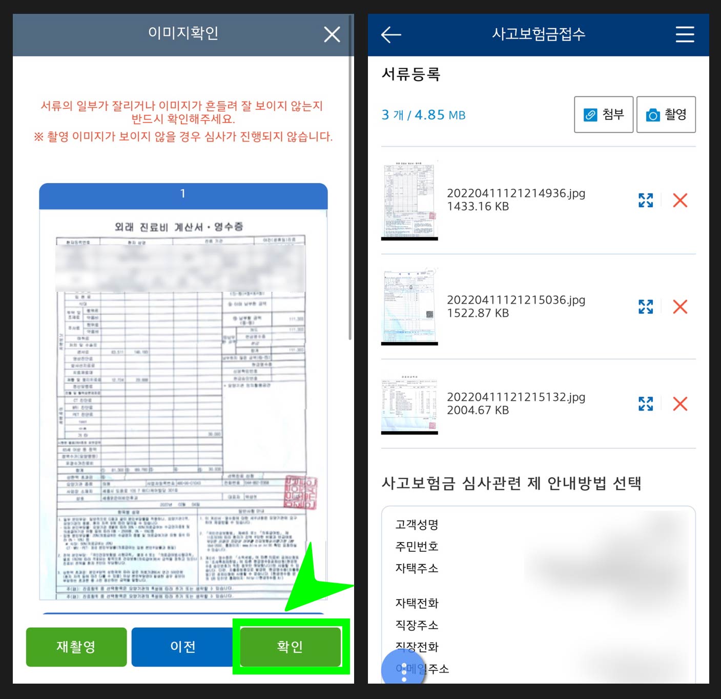 *서류 첨부할 때는 이미 찍은걸 올리는거보다 교보생명앱 자체에서 촬영해서 올리는게 선명하게 잘 올라간다. 사진을 첨부하면 뿌옇게 올라가기도 해서 서류보완요청이 오는 귀찮은 일이 발생할 수도 있다.