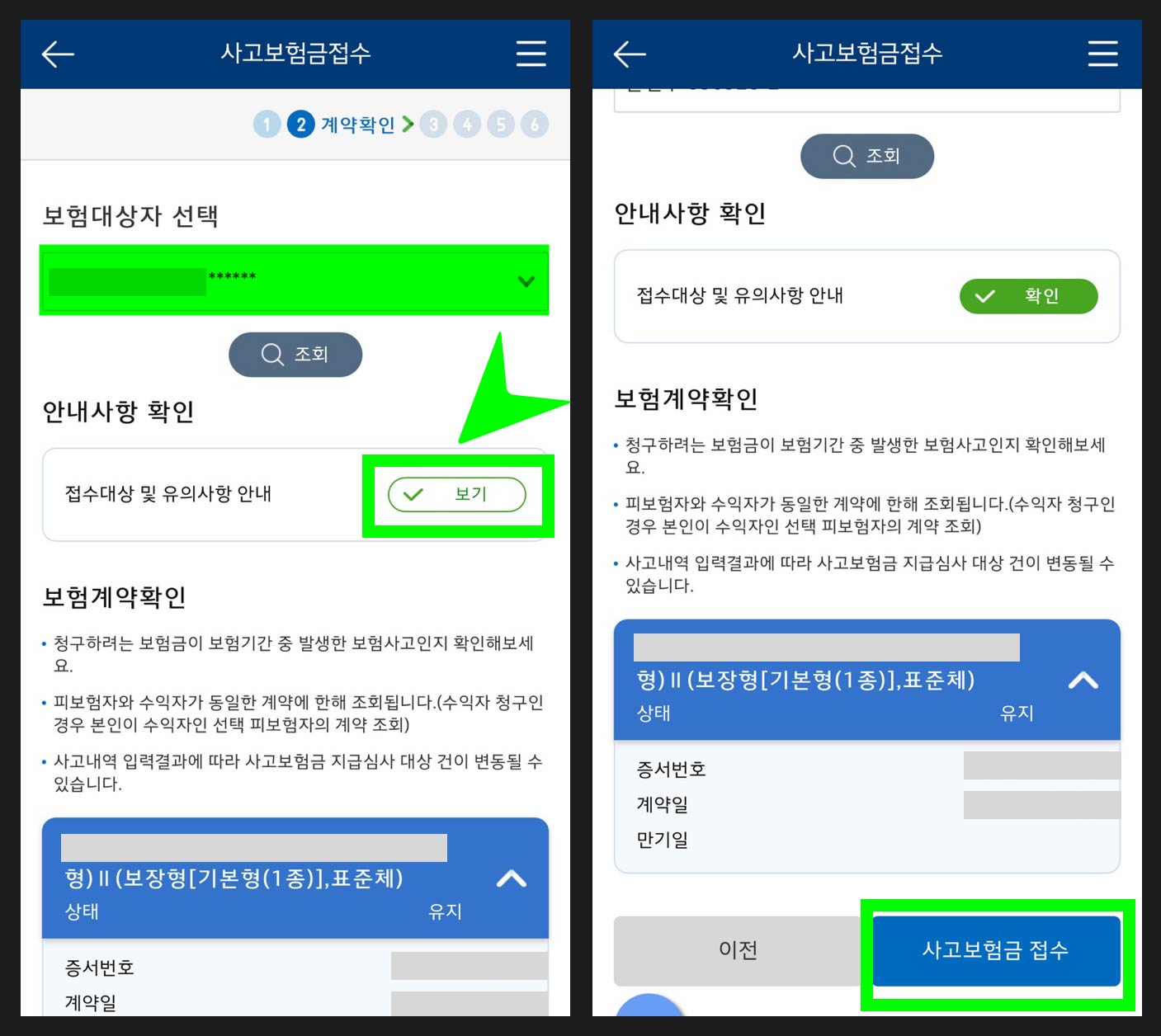 보험대상자 (나) 선택 ▶ 안내사항 [보기] ▶ 사고보험금 접수