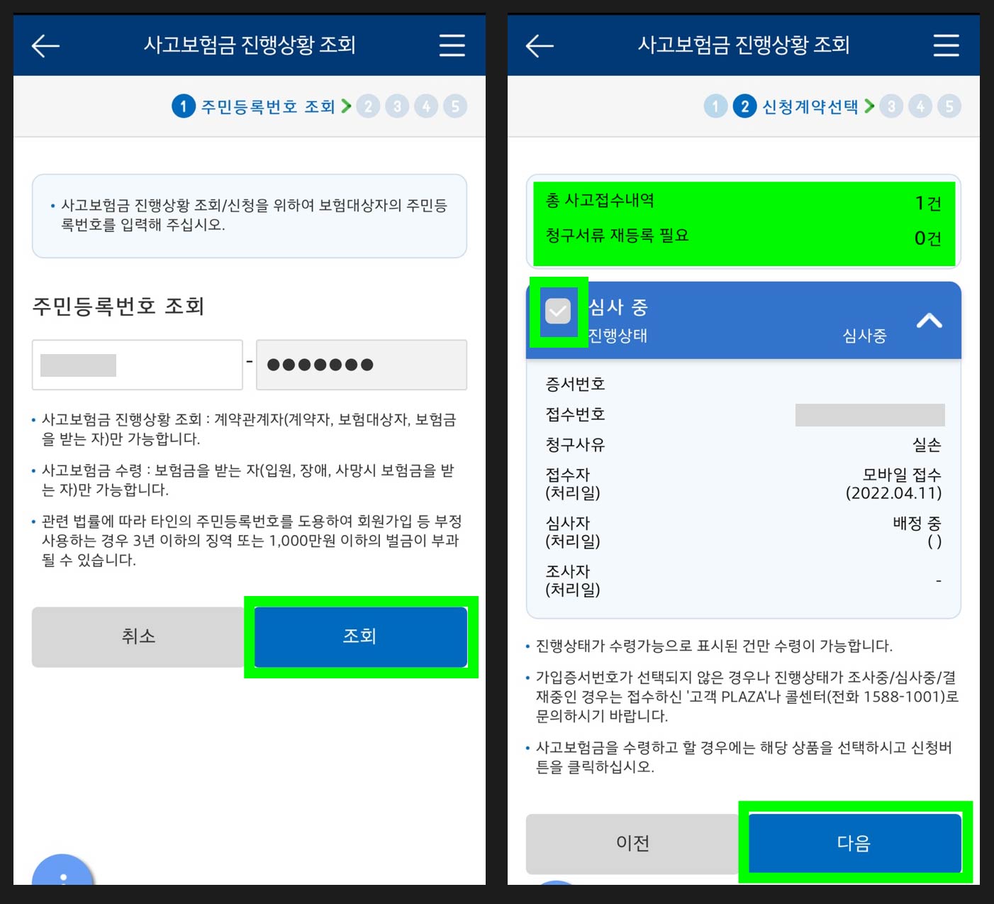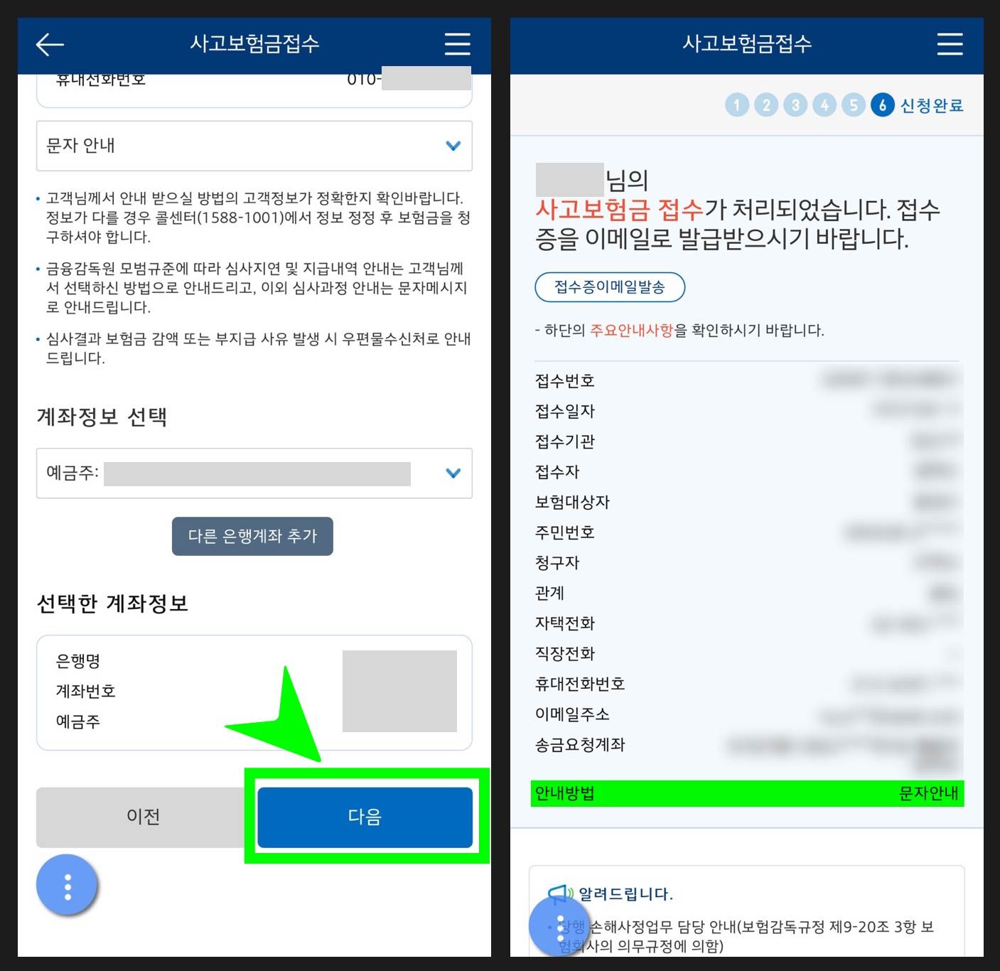 사고보험금접수 ▶ 내 정보 확인 후 [다음]
