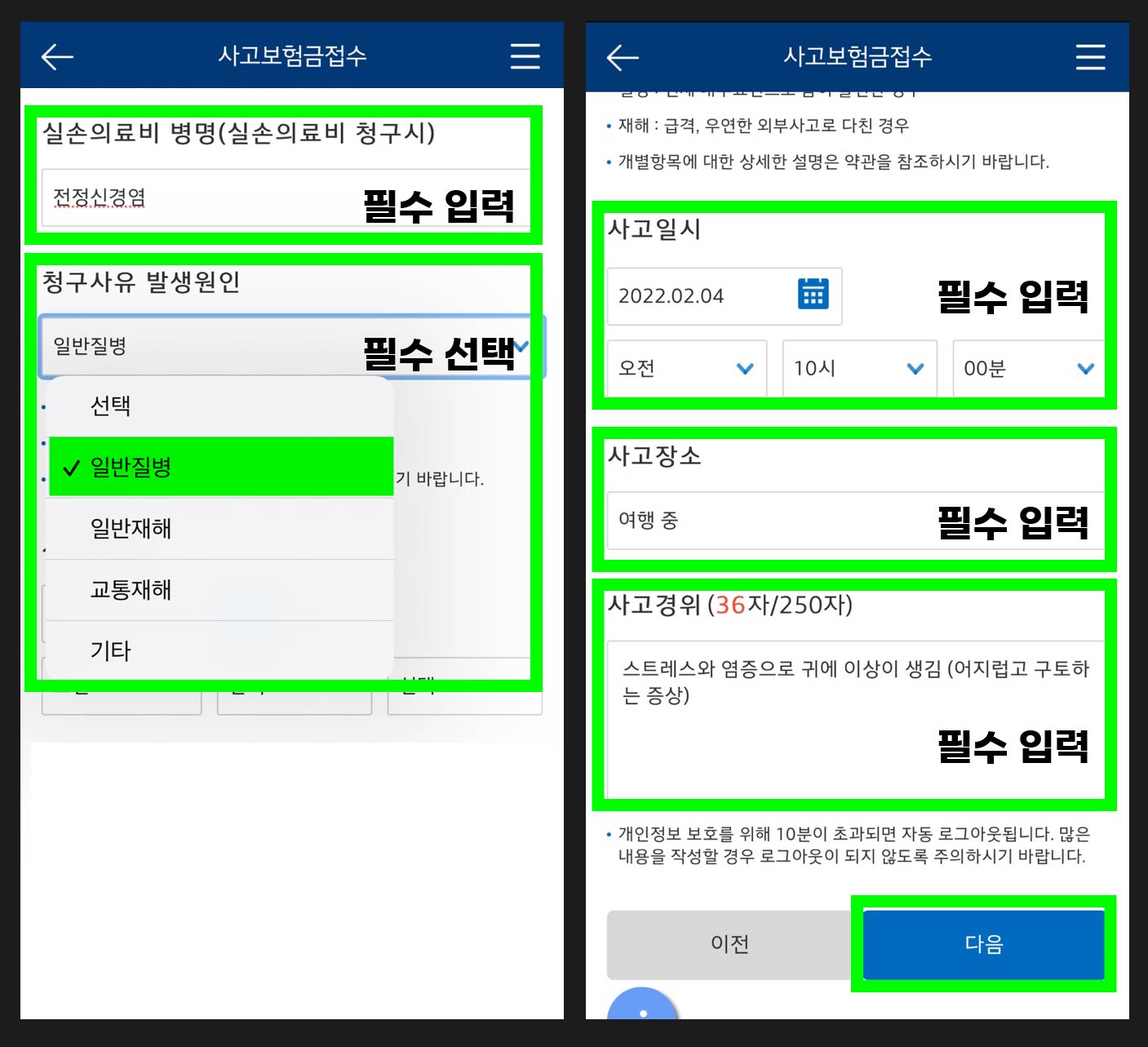 · 사고장소 : 필수입력 (보통 '집', '회사' 뭐 이렇게 적어도 된다. 나는 여행 중에 어지럽고 구토해서 그냥 '여행중'이라고 적었다.)