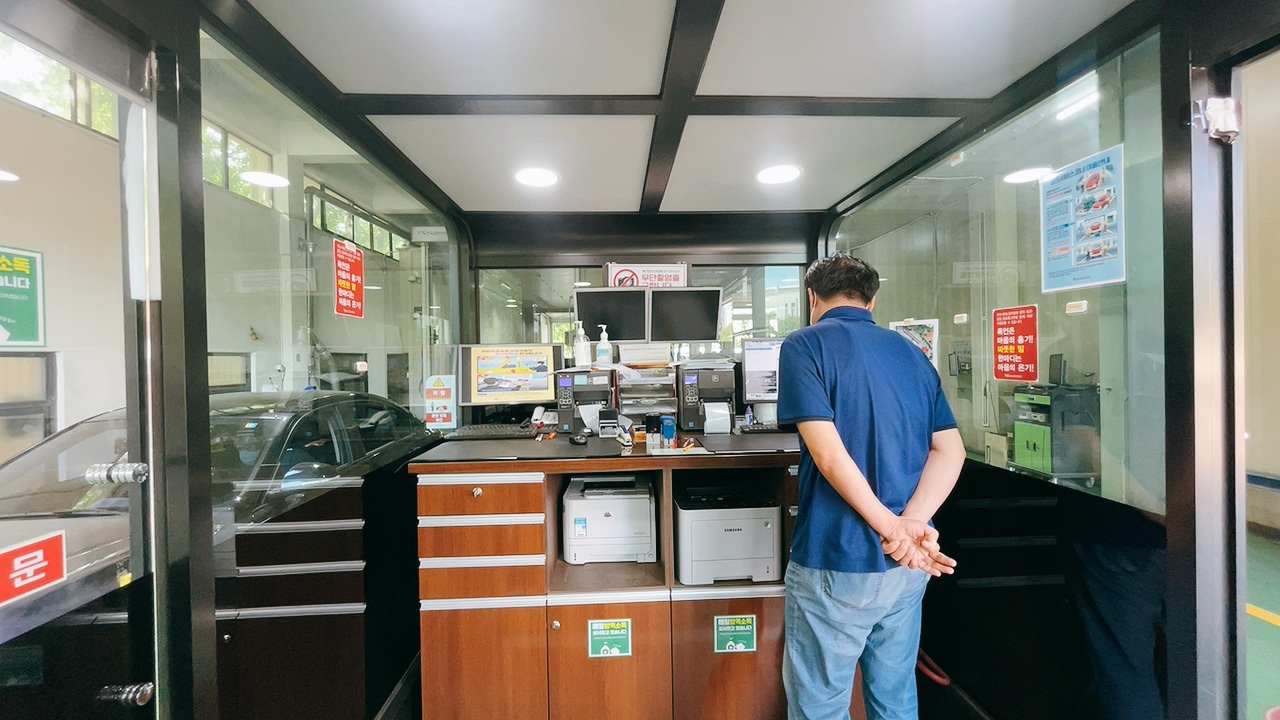 간이 컨테이너박스같은 곳이 자동차검사 받으러 온 차주들의 대기실이다. 차 검사 자체는 10~15분이면 끝나는듯하니 대기실에 잘 있다가 정비사의 설명을 잘 듣고 가자.
