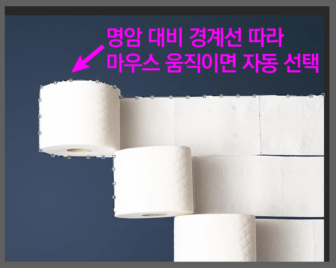 Manetic Lasso Tool은 명암대비가 확실한 영역을 따라 자동으로 선택영역이 지정되는 툴이다. 휴지와 배경은 명암 구분이 확실해서 경계선을 따라 마우스를 움직이면 저절로 경계선을 따라 영역이 지정된다. 간혹 대비가 애매한 부분이 지정되지 않는 경우가 있는데 그럴 때 처음부터 다시할 필요는 없고, 일단 다 따라 그려준 다음에 Select Tool에서