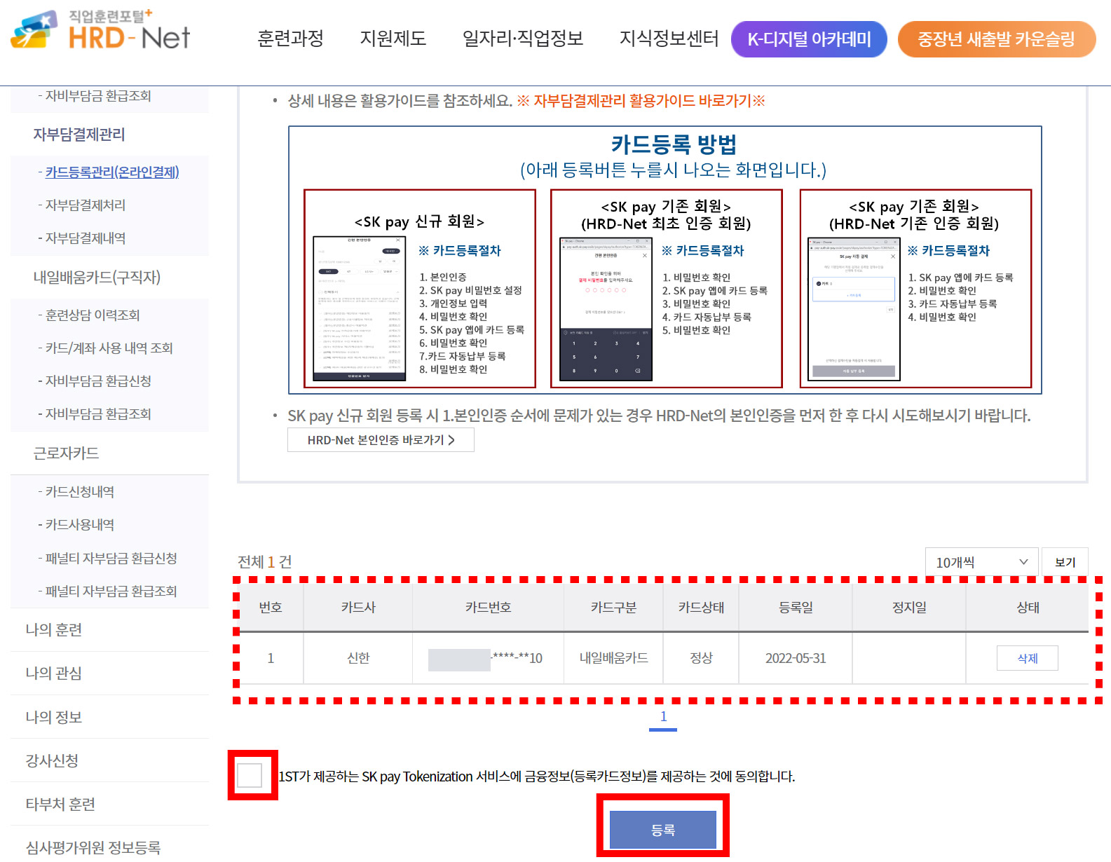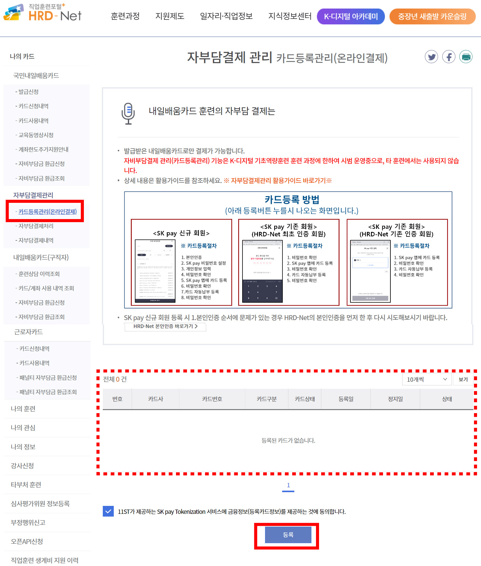 국민내일배움카드 온라인 수업을 듣는 경우에 국비지원금 빼고 자비부담액은 HRD-net에서 카드 결제를 해야한다. 내일배움카드가 있어도 HRD-net 내에서 따로 결제 가능하도록 자부담결제카드 등록을 해야 온라인 결제를 할 수 있다.