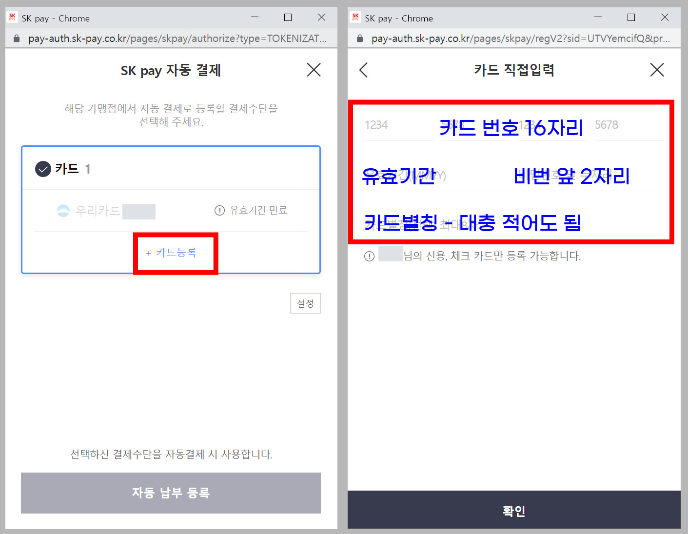 (아이디 로그인만으로는 자부담 카드 등록이 안된다)