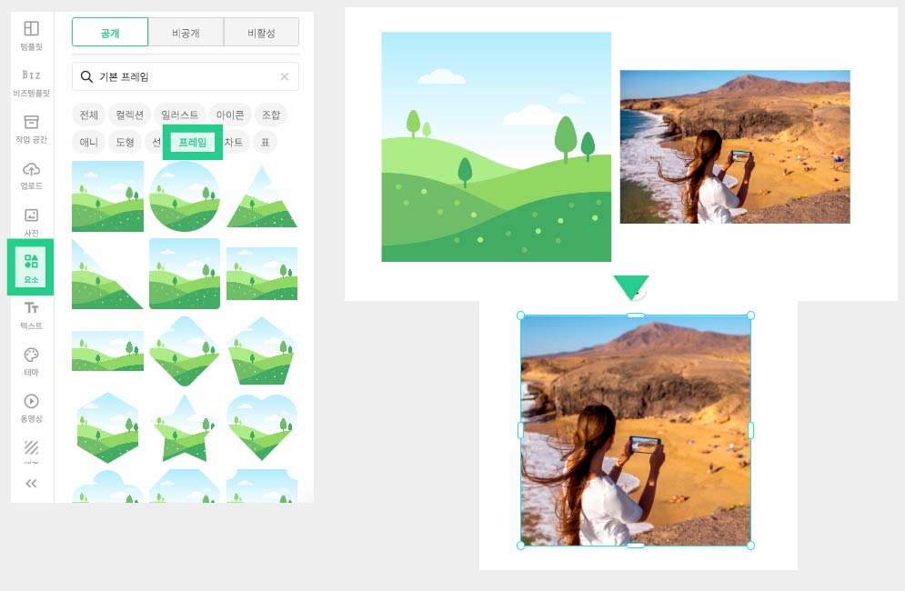 일러스트레이터나 포토샵에서는 SHIFT 키를 눌러야 사이즈를 원래 비율대로 조정이 가능한데 (물론 포토샵이나 일러에서도 SHIFT키 안 누르고 원래비율대로 조정 가능하게 환경설정은 할 수 있는데 그게 또 손에 안 익어서 불편하기도하다) 미리캔버스에서 사진, 텍스트, 도형 등 사이즈 조정시 그냥 단축키 없이 정사이즈비율로 조정이 가능하다. 이 기능 은근히 되게 편하다.