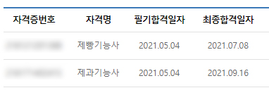 제빵 실기 시험은 학원다니는 도중에 접수해서 시험보고 한 번에 붙었고, 제과는 학원 수업 종료 후 두 달이 지나 3번의 실기 시험을 본 뒤에 붙었다.