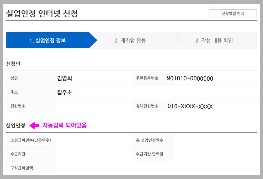 【실업인정정보】 에서 본인 정보 입력