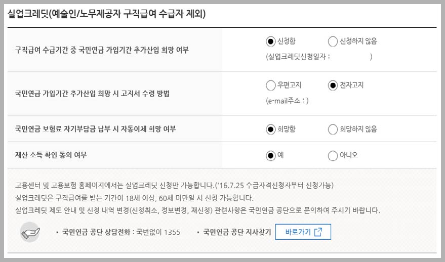 실업크레딧 신청 희망 여부 체크