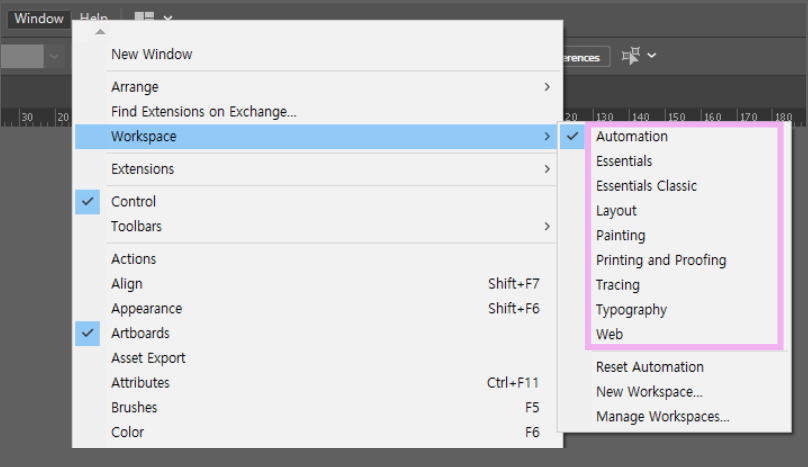 Adobe Illustrator CC 프로그램의 최상단 툴바 [Window] - Workspace - 하위 옵션 을 이것저것 클릭해보면 왼쪽의 툴바 모양이 다 바뀌는 것을 볼 수 있다.