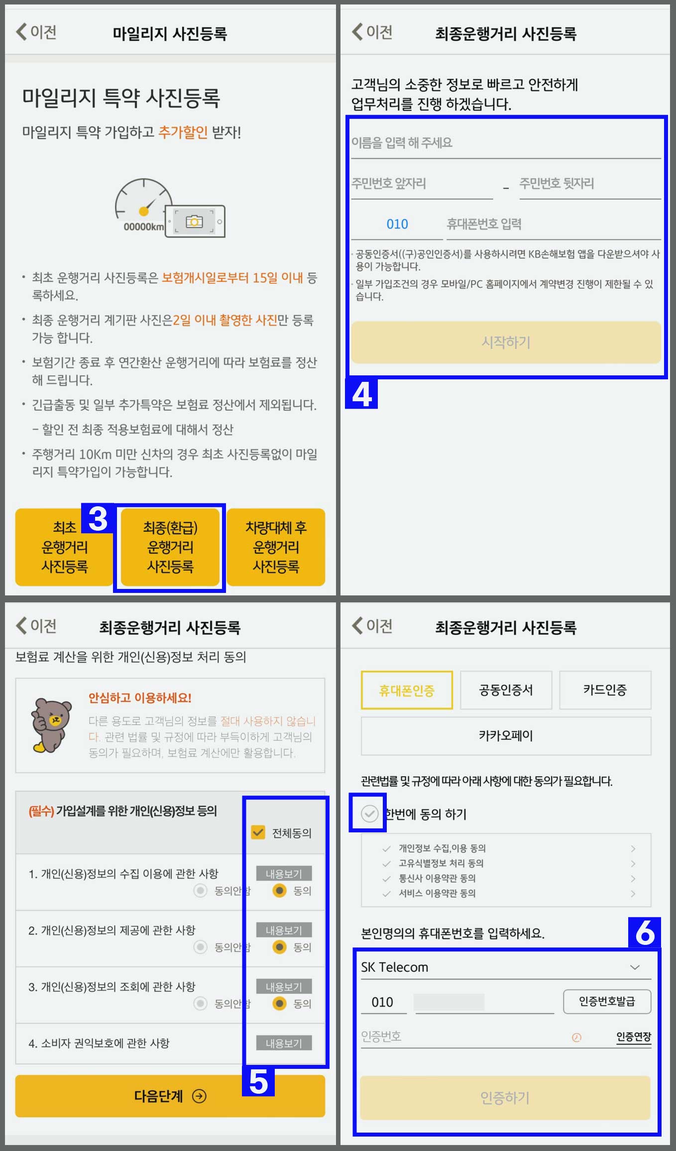 새로 신청한다면 【최초 운행거리 사진 등록】 / 작년에 최종운행거리(올해 최초 운행거리)를 등록했다면 【최종(환급)운행거리 사진 등록】 클릭 > 이름, 주민번호, 휴대폰 번호 입력 후 본인인증 【개인정보 모두 동의 체크】 > 【본인인증】 (휴대폰, 공동인증서, 카드인증, 카카오페이 등) >