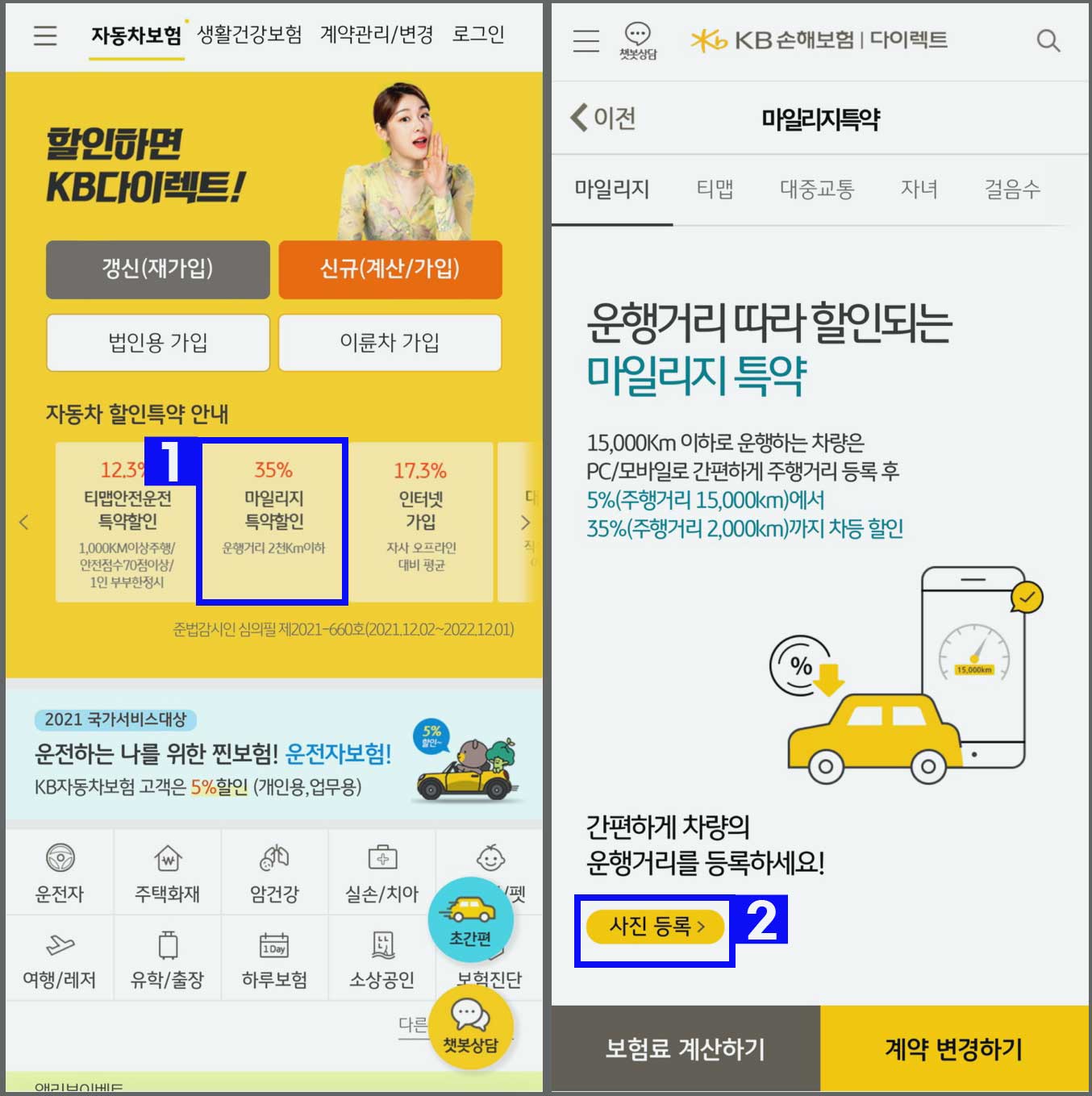 마일리지 특약 할인 신청 후 30일 내에 계기판 사진과 차번호가 나온 차량 전면 사진을 KB 다이렉트앱에 올려야만 마일리지 특약 할인을 받을 수 있다.
