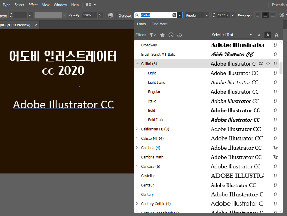 어도비 일러스트레이터 cc 2020에서 내가 바꾸려고 선택한 글귀의 폰트를 선택하기 위해 텍스트 버튼을 클릭하면 해당되는 글귀가 각자의 폰트로 미리보기 지원이 된다.